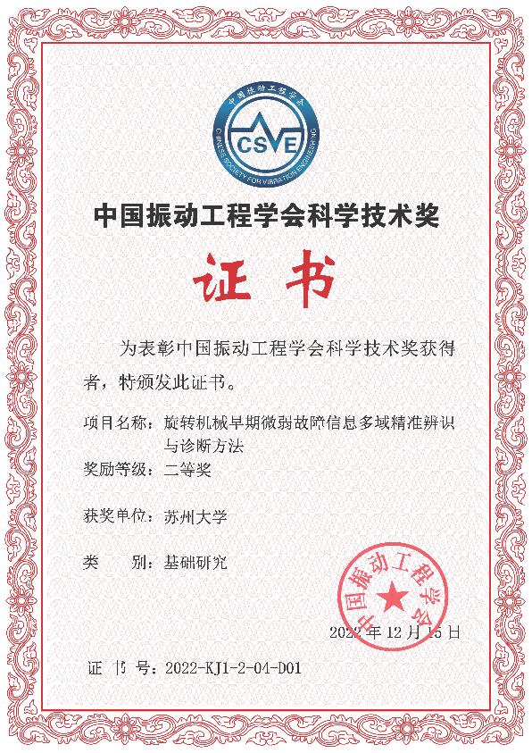 根据《中国振动工程学会科学技术奖励实施细则(试行)》(2022年修订),经形式审查、专家初评、评审委员会评审,学会科学技术奖励委员会审核,决定表彰2022年度中国振动工程学会科学技术奖获奖项目7项(一等奖2项,二等奖5项),研究所黄伟国教授牵头(获奖人:黄伟国、朱忠奎、江星星、樊薇、石娟娟)的项目“旋转机械早期微弱故障信息多域精准辨识与诊断方法” 荣获2022年度中国振动工程学会科学技术奖二等奖。