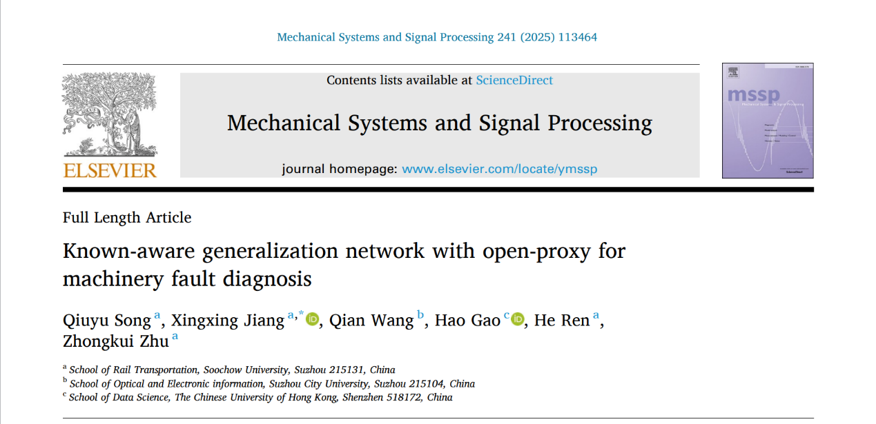 Qiuyu Song, Xingxing Jiang, Qian Wang, Hao Gao, He Ren, Zhongkui Zhu. Known-aware generalization network with open-proxy for machinery fault diagnosis[J]. Mechanical Systems and Signal Processing, 2025, 241: 113464.