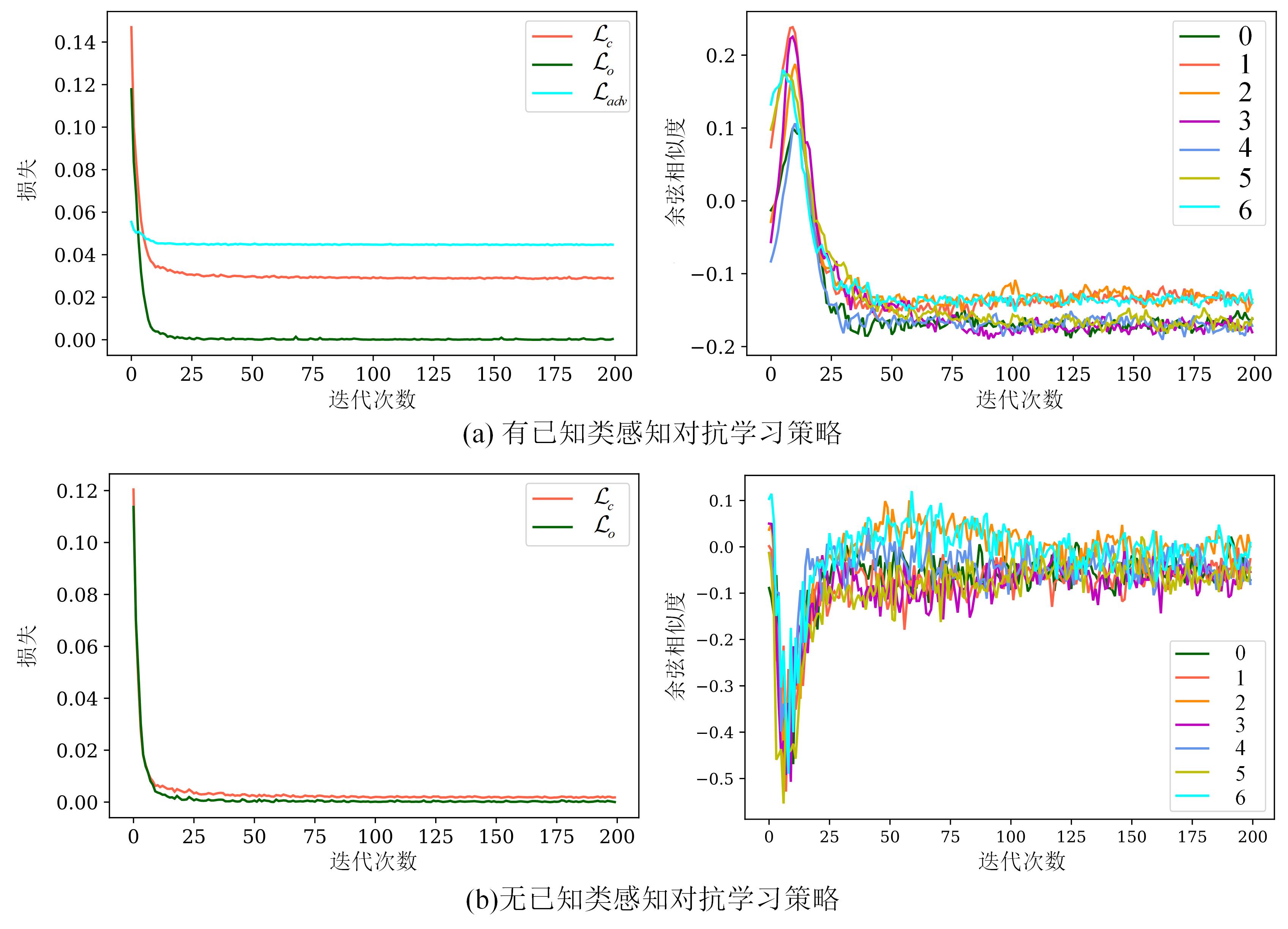 图3 模型训练过程中损失函数的收敛曲线以及未知类代理和已知类代理之间的余弦相似度曲线(原文图14)