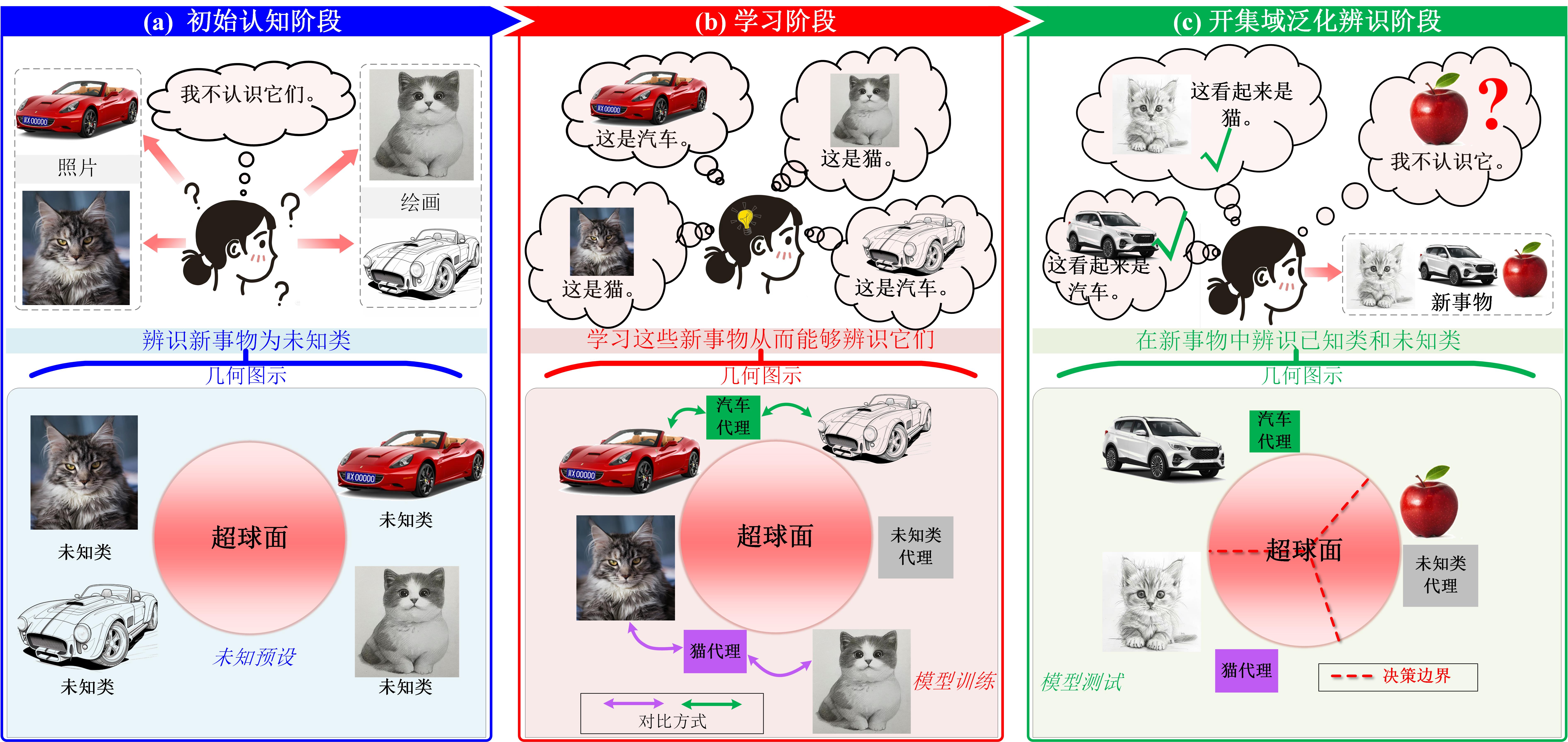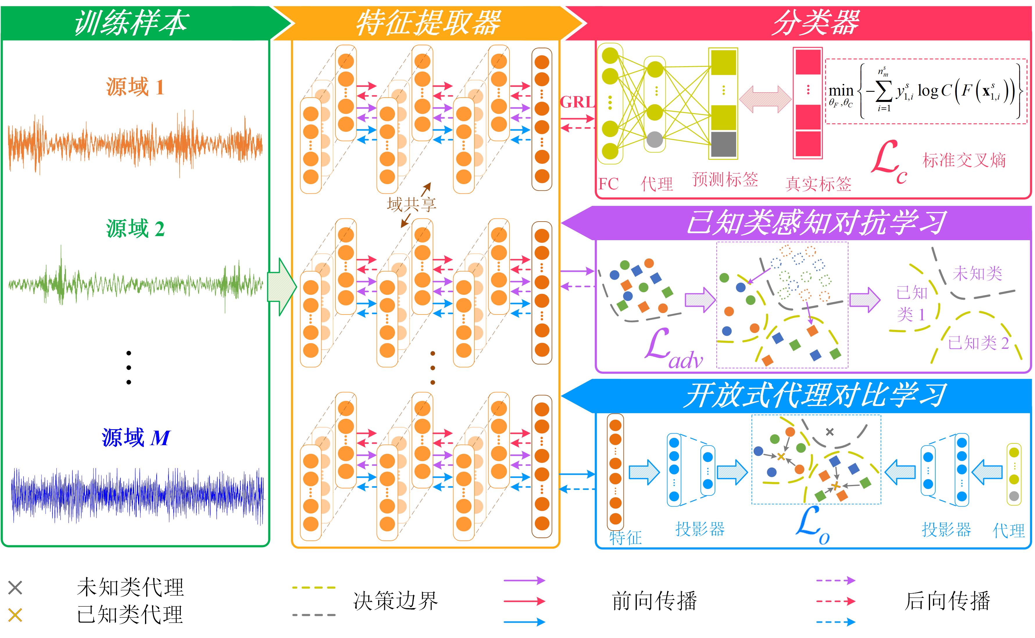 (1) 设计了一种借鉴人类学习新事物思路的已知类感知对抗学习策略,在模型训练时通过已知类样本对“未知预设”机制的对抗博弈,解决了目标工况样本无法提前参与训练时已知故障类别与新型未知故障类别间决策边界的学习难题。