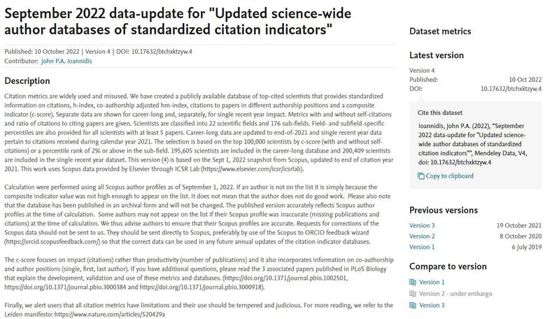 2022年,Ioannidis教授团队对此数据进行了更新,考虑到不同子研究领域的差异,从近7百万科学家中,筛选出世界Top 2%的科学家,涵盖文、理、工学科,包括了22个领域和176个子学科,更新的数据中还显示了每位科学家在其子学科内的综合引用指数排名。此数据提供了一个面向科学家长期科研表现的衡量指标,能够更客观、更真实的反映科学家的影响力。