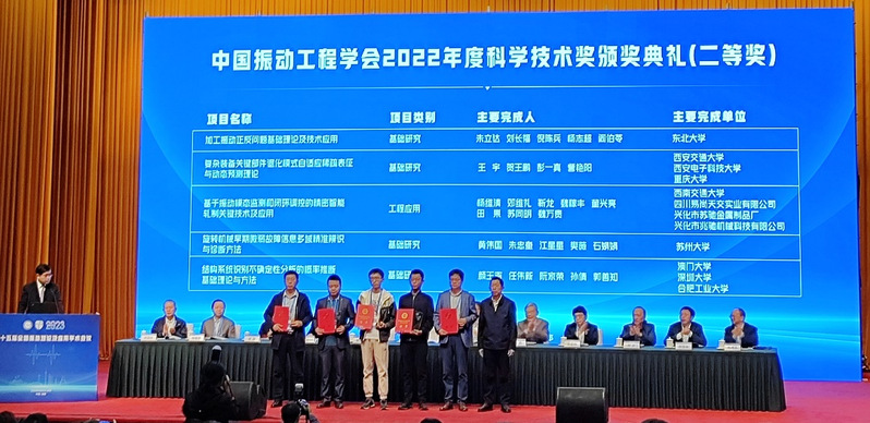 开幕式期间颁发了2022年度中国振动工程学会青年科技奖、科学技术奖、国际学术贡献奖证书及奖杯。我所黄伟国、朱忠奎、江星星、樊薇、石娟娟五位老师作为完成人的科研成果“旋转机械早期微弱故障信息多域精准辨识与诊断方法”获得中国振动工程学会科学技术二等奖,黄伟国教授上台领奖。