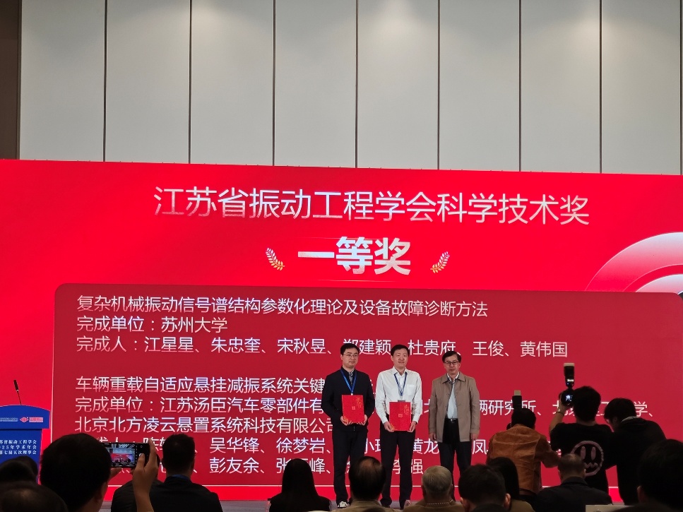 研究所江星星教授牵头(获奖人:江星星、朱忠奎、宋秋煜、郑建颖、杜贵府、王俊、黄伟国)的“复杂机械振动信号谱结构参数化理论及设备故障诊断方法”项目荣获江苏省振动工程学会科学技术一等奖。图为江星星教授上台领奖。