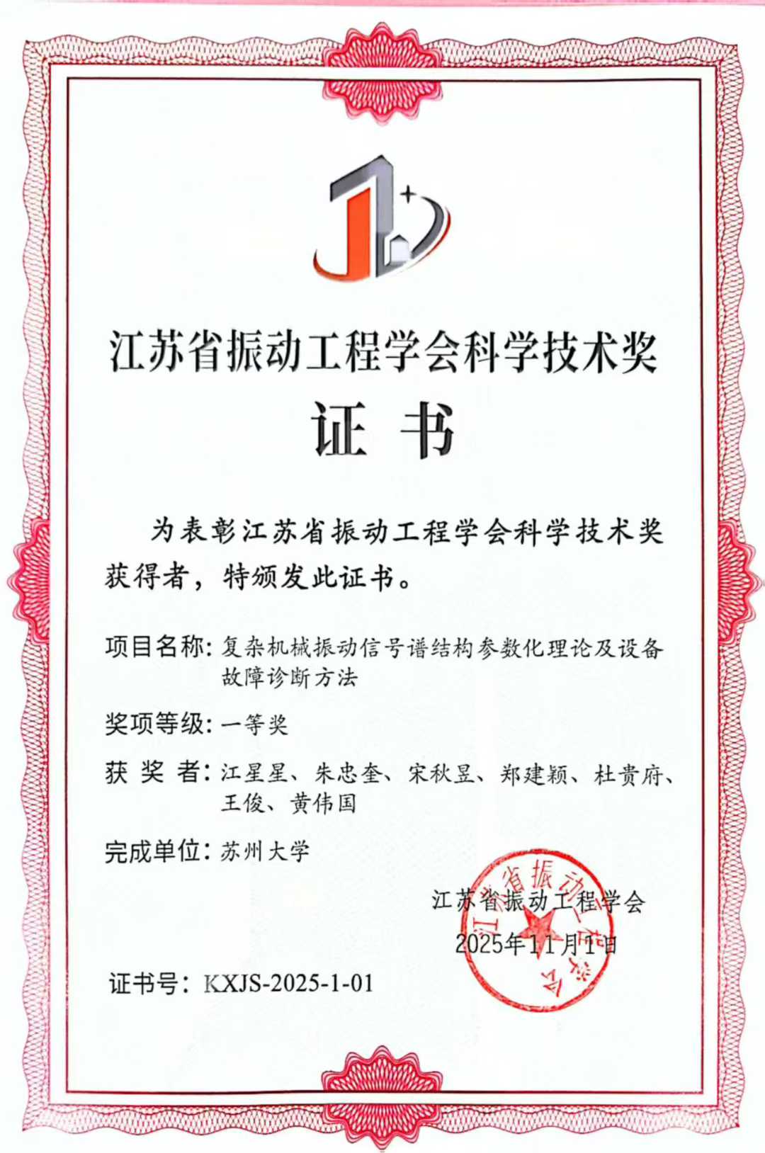 图为江苏省振动工程学会科学技术一等奖的获奖证书。