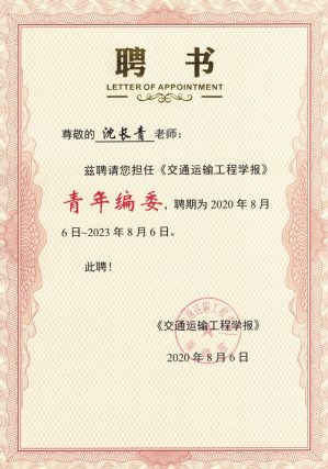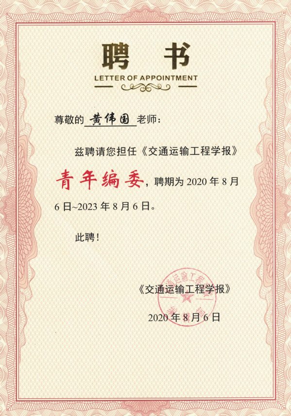 近日,研究所黄伟国、沈长青两位老师获聘为交通运输工程学科权威期刊《交通运输工程学报》青年编委并获颁聘书。