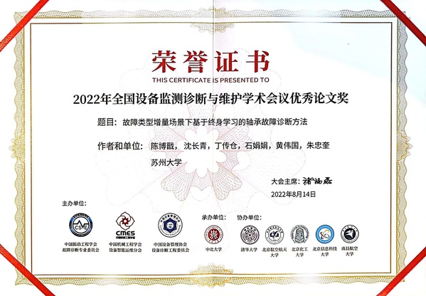 此次会议共安排了300多篇墙报论文,硕士研究生陈博戬同学提交的墙报论文“故障类型增量场景下基于终身学习的轴承故障诊断方法”荣获“2022年全国设备监测诊断与维护学术会议优秀论文奖”,是本次会议10篇获奖论文之一。