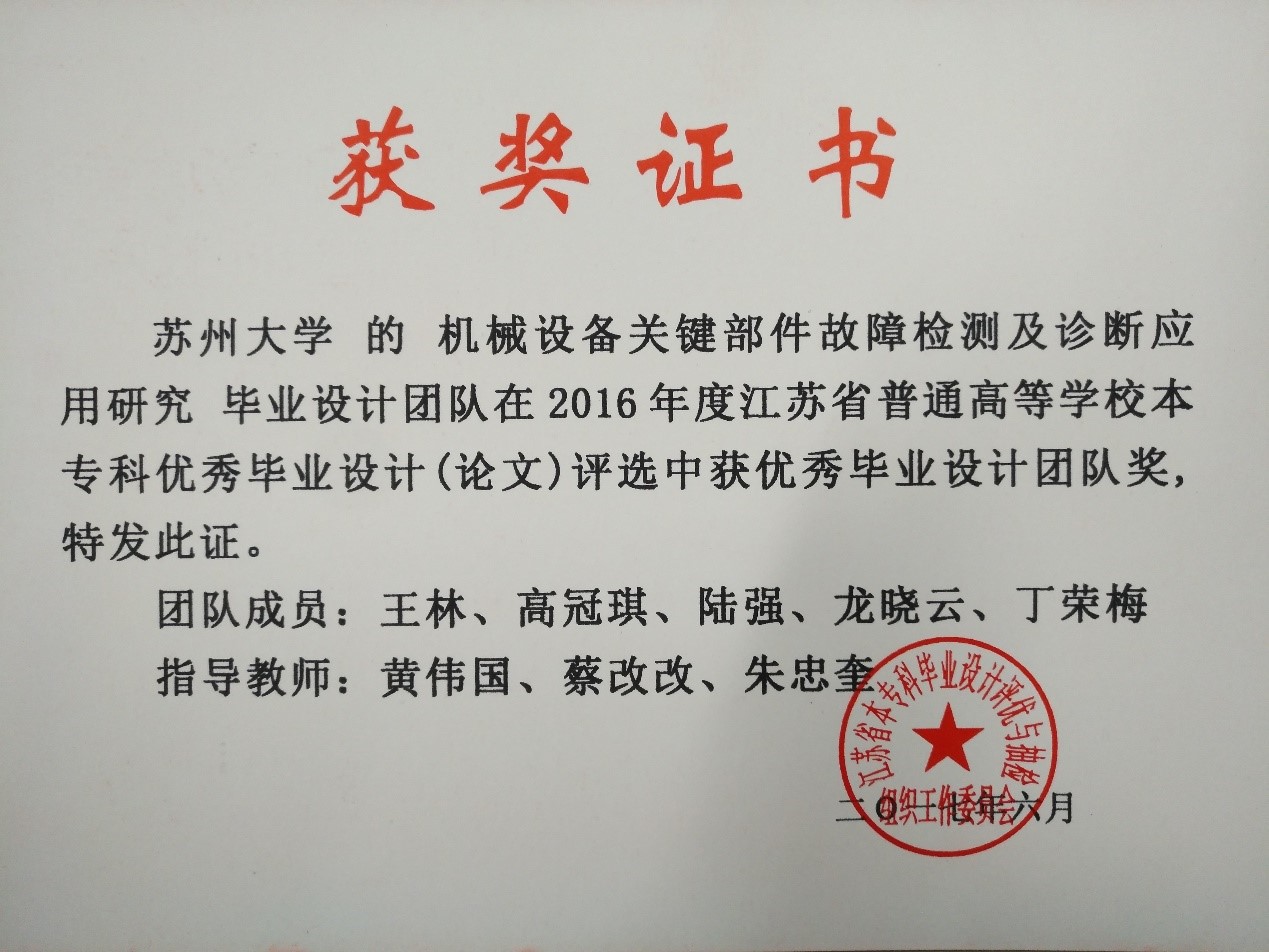 近日,研究所“机械设备关键部件故障检测及诊断应用研究”毕业设计团队(团队成员:王林、高冠琪、陆强、龙晓云、丁荣梅;指导教师:黄伟国副教授、蔡改改副教授、朱忠奎教授)在2016年度江苏省普通高等学校本专科优秀毕业设计(论文)评选中荣获“优秀毕业设计团队奖”。同时,团队成员王林同学的毕业论文还获得2016年江苏省优秀毕业设计(论文)二等奖。团队成员中,王林、高冠琪、丁荣梅同学本科毕业后继续在我研究所攻读硕士学位,陆强、龙晓云同学进入中国科学技术大学攻读硕士学位。据悉,该优秀团队为2016年度苏州大学唯一的省优秀毕业设计团队。