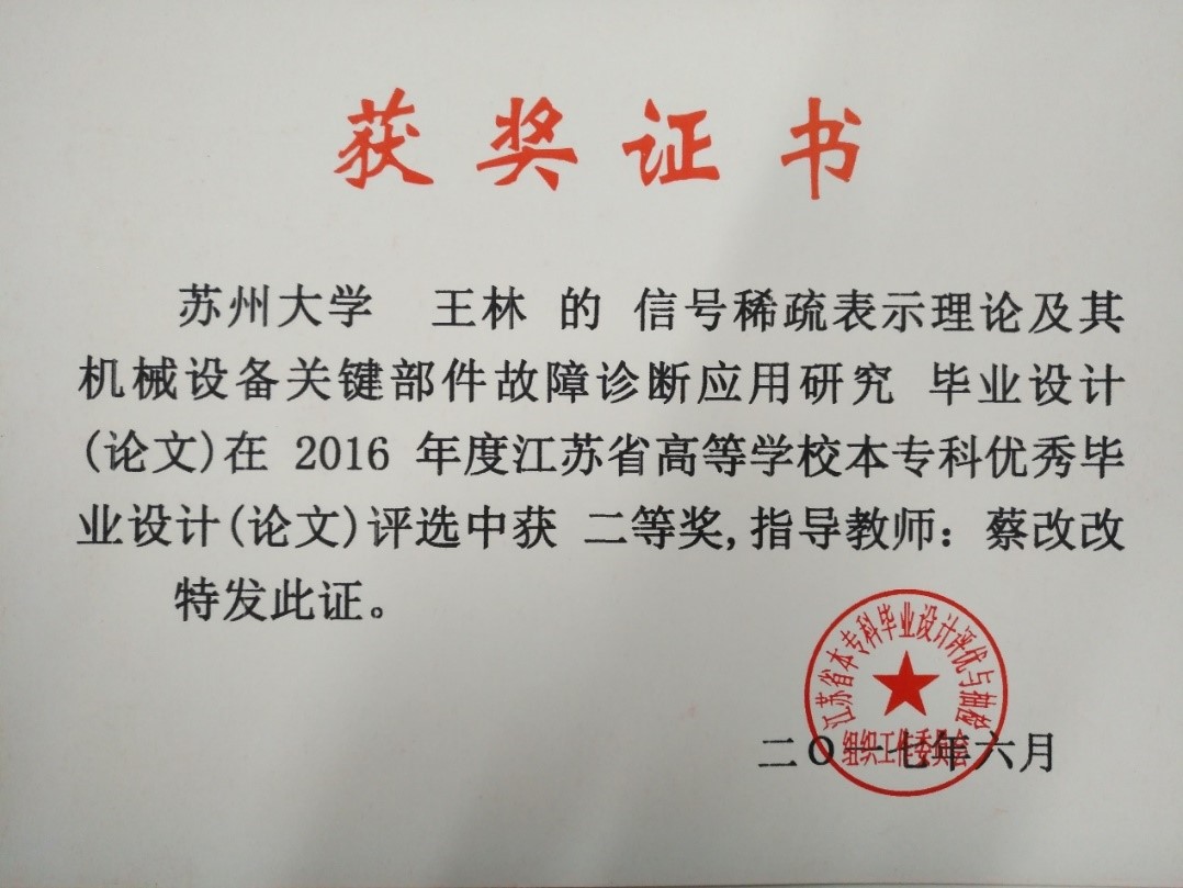 近日,由研究所蔡改改副教授指导、王林同学完成的“信号稀疏表示理论及其机械设备关键部件故障诊断应用研究”毕业设计(论文)在2016年度江苏省普通高等学校本专科优秀毕业设计(论文)评选中荣获二等奖。 同时,王林同学的毕业设计论文和另外四位同学的毕业设计论文还同时获得江苏省优秀毕业设计团队奖。