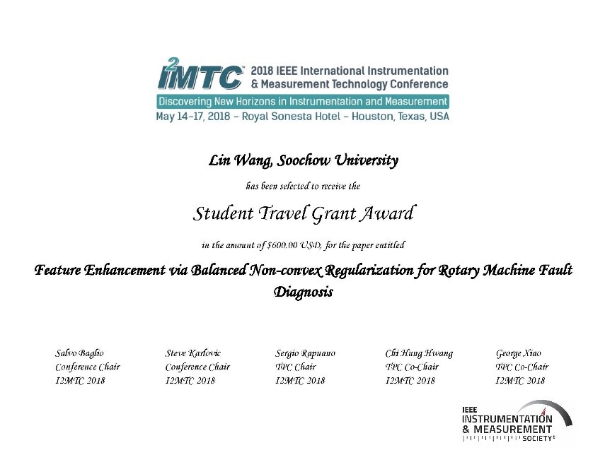 此外,王林同学在此次会议中获得2018年度国际仪器仪表与测量技术会议(I2MTC 2018)学生旅行奖(Student Travel Award),共10人获得此殊荣。