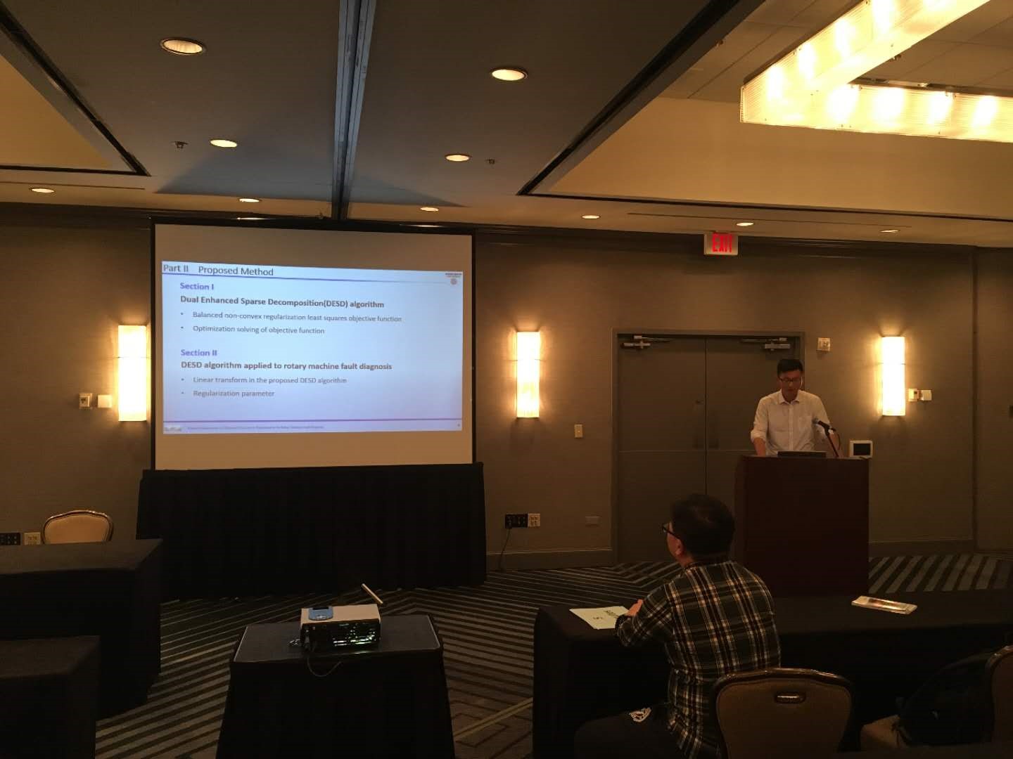 我所王林硕士在Advanced Measurement and Data Processing for Complex Engineering System Health Monitoring专题分会场进行了题为“Feature Enhancement via Balanced Non-convex Regularization for Rotary Machine Fault Diagnosis”的汇报,与多位学者就稀疏表示在机械故障特征提取方面的应用进行探讨。